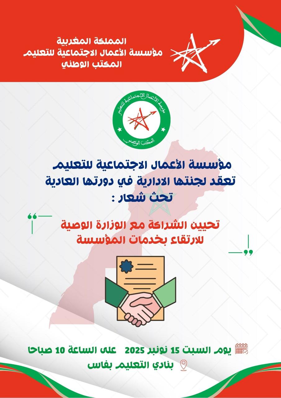 ويأتي هذا الاجتماع الأول للجنة الإدارية في الولاية الحالية، لتأكيد انخراط المؤسسة في مسار وطني لتأهيل العمل الاجتماعي التربوي، ولإعادة بناء الشراكة مع الوزارة الوصية بما يضمن توحيد الجهود والارتقاء بالخدمات الاجتماعية المقدّمة لأسرة التربية والتكوين.