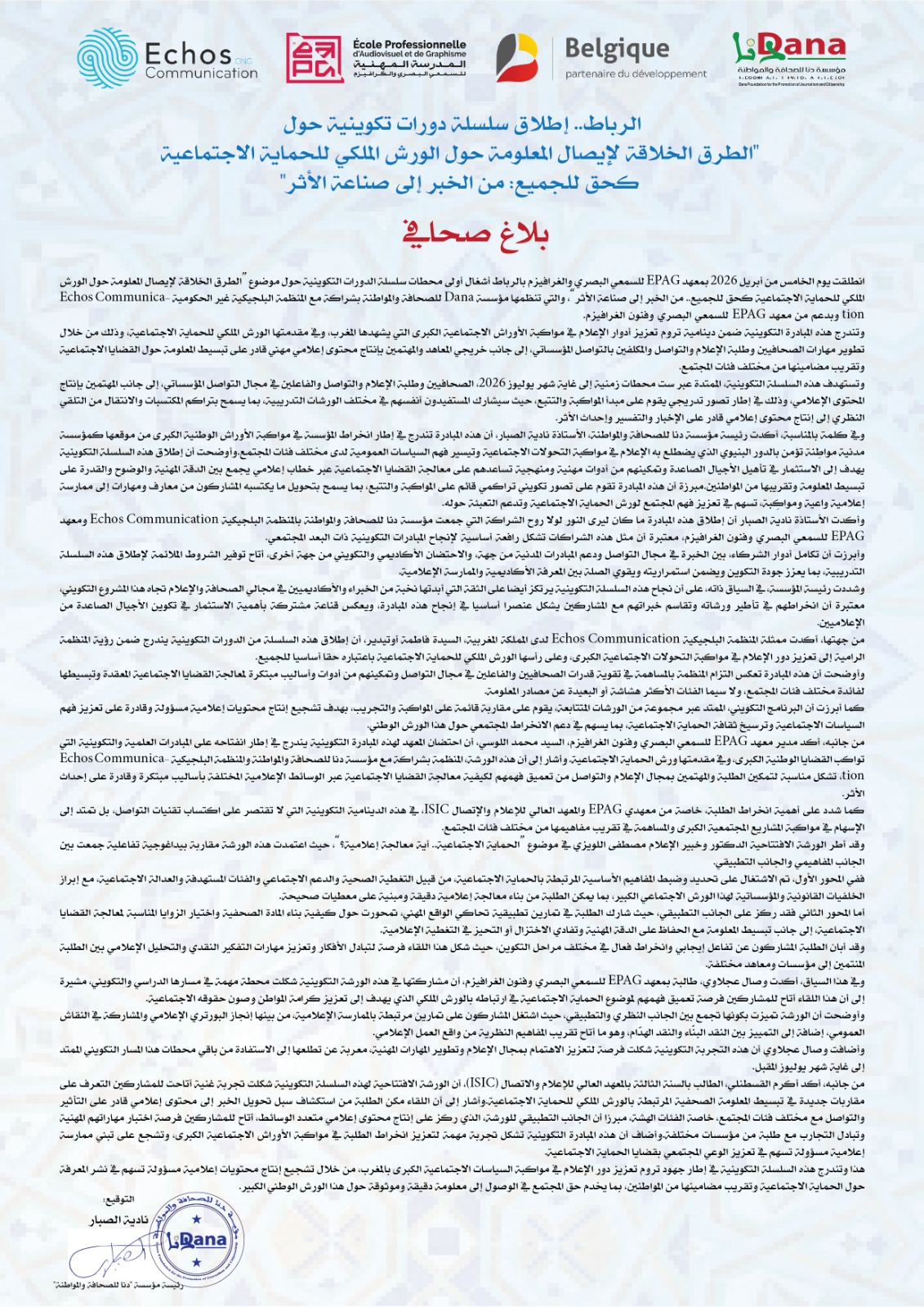 انطلقت يوم الخامس من أبريل 2026 بمعهد EPAG للسمعي البصري والغرافيزم بالرباط أشغال أولى محطات سلسلة الدورات التكوينية حول موضوع “الطرق الخلاقة لإيصال المعلومة حول الورش الملكي للحماية الاجتماعية كحق للجميع.. من الخبر إلى صناعة الأثر”، والتي تنظمها مؤسسة Dana للصحافة والمواطنة بشراكة مع المنظمة البلجيكية غير الحكومية Echos Communication وبدعم من معهد EPAG للسمعي البصري وفنون الغرافيزم.