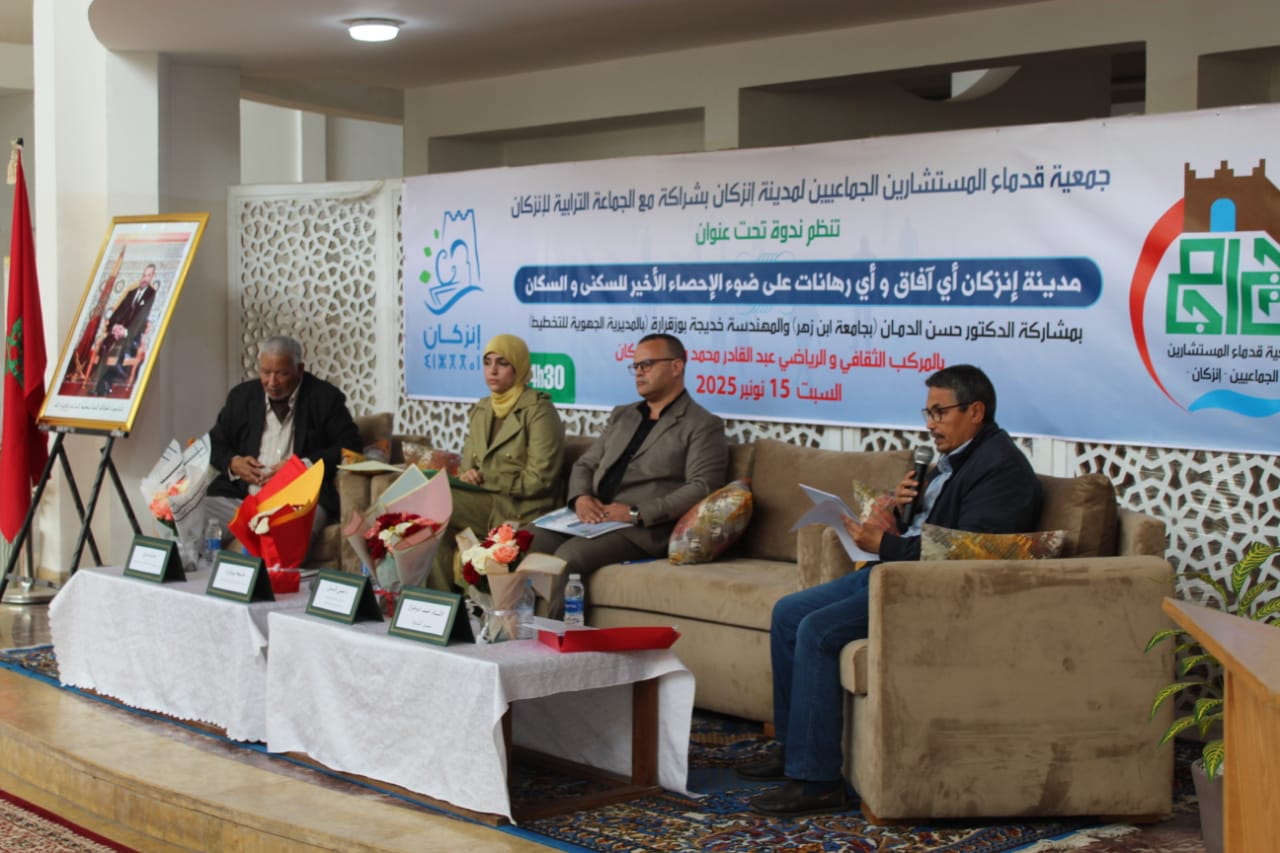 في إطار أنشطتها السنوية ،نظمت جمعية قدماء المستشارين الجماعيين بإنزكان يوم السبت 15 نونبر الجاري ،أشغال الندوة العلمية تحت عنوان ” مدينة إنزكان أي آفاق وأي رهانات على ضوء الإحصاء الأخير للسكنى و السكن “،والتي أطرها الدكتور حسن الدمان ،أستاذ العلوم الاقتصادية بجامعة إبن زهر ،وخديجة بوزقرارة ،مهندسة بالمديرية الجهوية للتخطيط باكادير ،بحضور وازن لفعاليات جمعوية وسياسية وأكاديمية بالمنطقة .