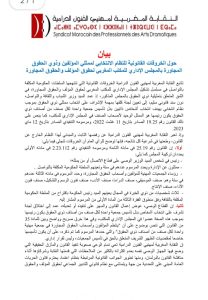 وحذّرت النقابة من أن استمرار هذا الوضع سيقوّض الثقة في مؤسسات حماية حقوق المؤلف بالمغرب، داعية الوزارة إلى التراجع الفوري عن هذا المسلسل الانتخابي غير المشروع، وفتح مشاورات جدية من أجل تعديل جزئي للقانون رقم 25.19، يضمن تمثيلية عادلة وشفافة لذوي الحقوق، ويحترم روح القانون والدستور.