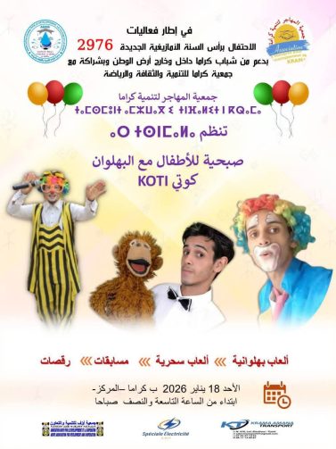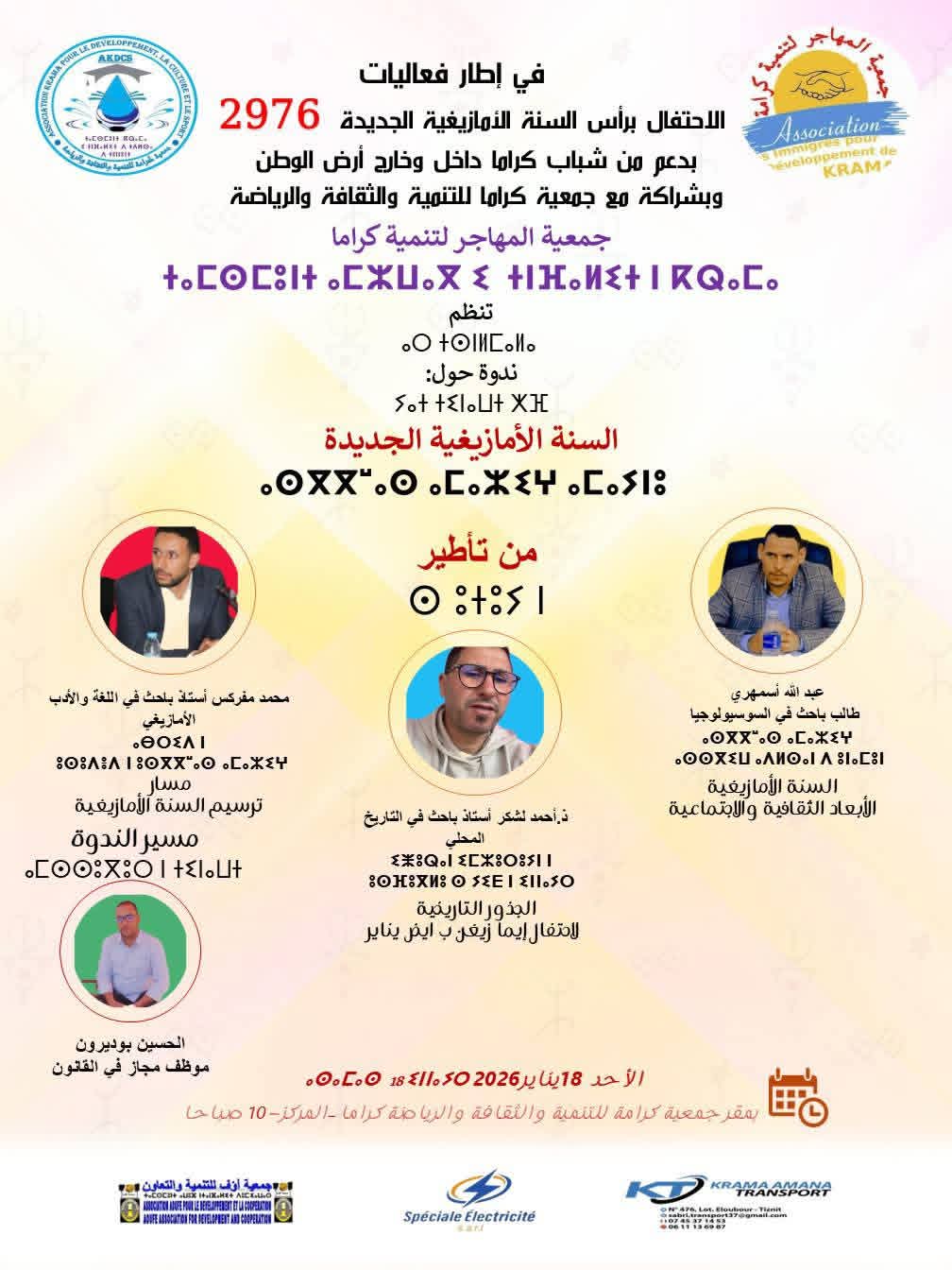 تحت شعار (ايض اناير هوية متجدرة وتضامن جماعي) ، تستعد جمعية المهاجر بشراكة مع جمعية كرامة للتقافة والرياضة وبدعم من شباب كرامة من المهاجرين داخل الوطن وخارجه لتنظيم الدورة الأولى من الاحتفال برأس السنة الأمازيغية 2976 وسيُقام هذا الحدث الثقافي يوم الاحد 18 يناير ،2026، بمركز كراما جماعة تيغيرت إقليم سيدي افني في إطار سعي الجمعية لترسيخ قيم الأصالة والتجديد.