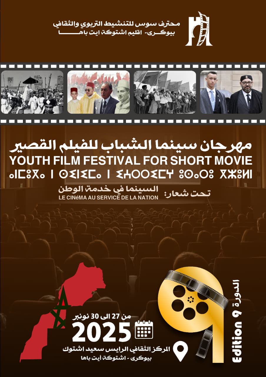 يعلن محترف سوس للتنشيط التربوي والثقافي بإقليم اشتوكة آيت باها، عن تنظيم الدورة التاسعة لمهرجان سينما الشباب للفيلم القصير من 27 إلى 30 نونبر 2025، وذلك بالمركز الثقافي الرايس سعيد أشتوك – بيوكرى، تحت شعار: “السينما في خدمة الوطن”.