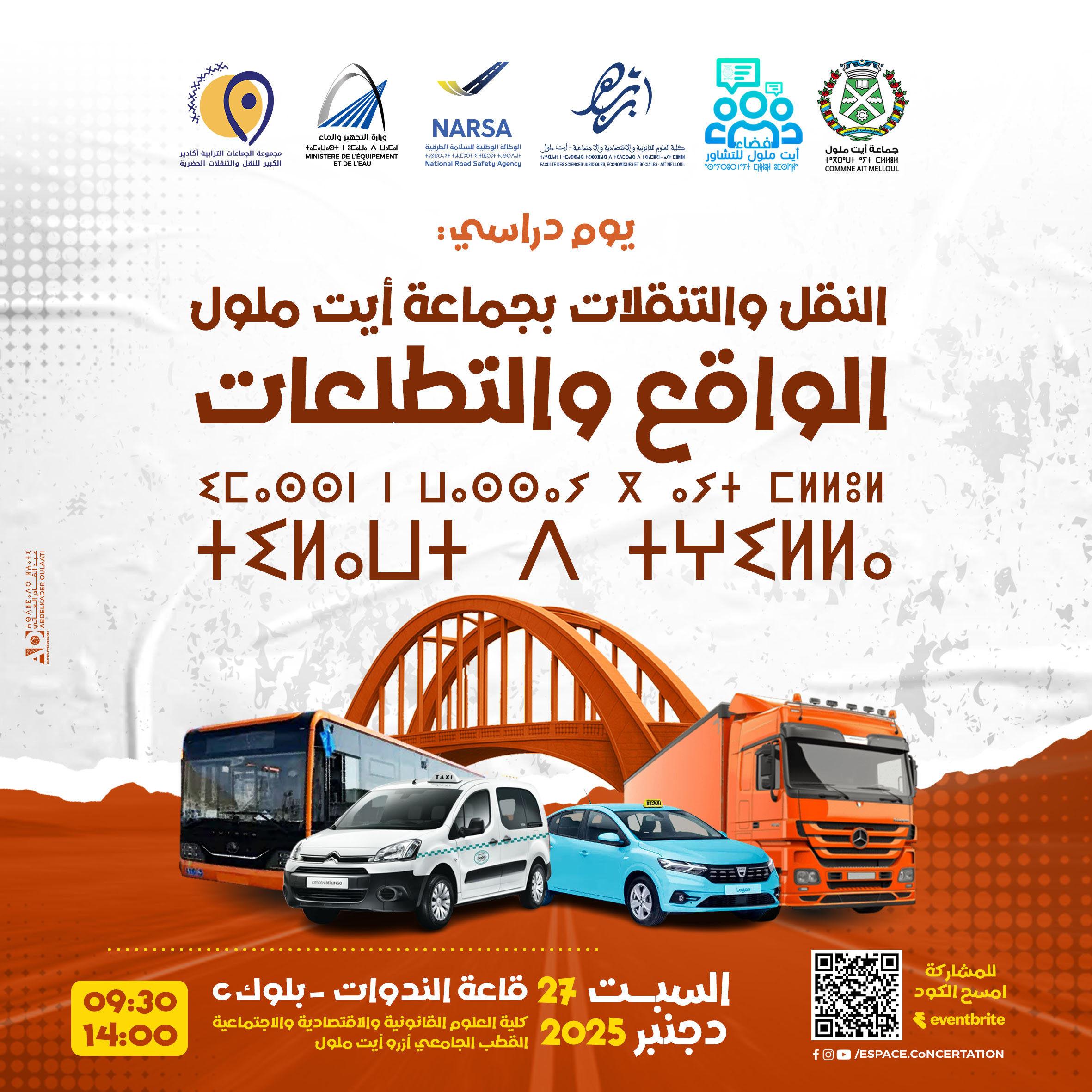 ويُنظم هذا اليوم الدراسي بمبادرة من فضاء أيت ملول للتشاور، وبمواكبة وشراكة مع جماعة أيت ملول، بتنسيق مع مجموعة الجماعات أكادير الكبير للنقل والتنقلات، المديرية الجهوية للتجهيز والنقل واللوجيستيك والماء بأكادير،المديرية الجهوية للوكالة الوطنية للسلامة الطرقية بأكادير، كلية العلوم القانونية والاقتصادية والاجتماعية بأيت ملول، مركب التكوين المهني بإنزكان أيت ملول، إلى جانب الجمعيات المهنية ذات الصلة، وبمشاركة نخبة من الأساتذة الجامعيين والخبراء والطلبة الباحثين وفعاليات المجتمع المدني المحلي ومهنيي قطاع النقل.